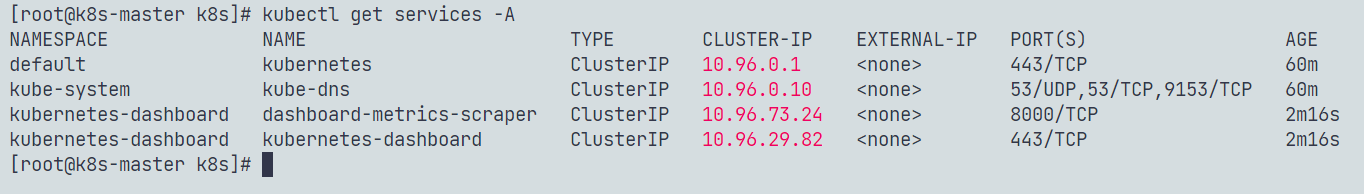 1 2 3 4 5 6 7 8 9 10 11 12 13 14 15 16 17 18 19 apiVersion: v1 ... name: kubernetes-dashboard namespace: kubernetes-dashboard resourceVersion: "343478" selfLink: /api/v1/namespaces/kubernetes-dashboard/services/kubernetes-dashboard uid: 8e48f478-993d-11e7-87e0-901b0e532516 spec: clusterIP: 10.100 .124 .90 externalTrafficPolicy: Cluster ports: - port: 443 protocol: TCP targetPort: 8443 selector: k8s-app: kubernetes-dashboard sessionAffinity: None type: ClusterIP