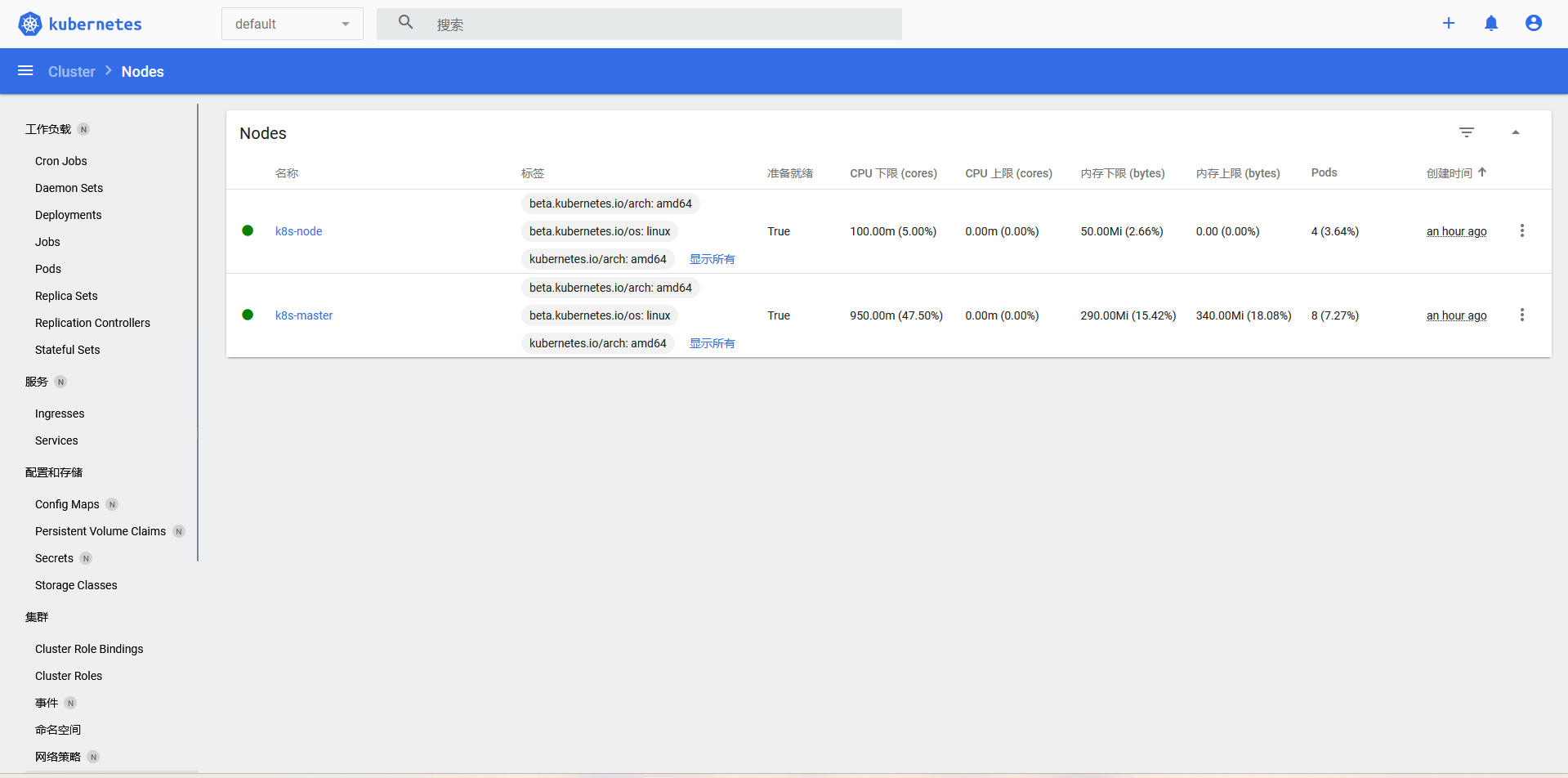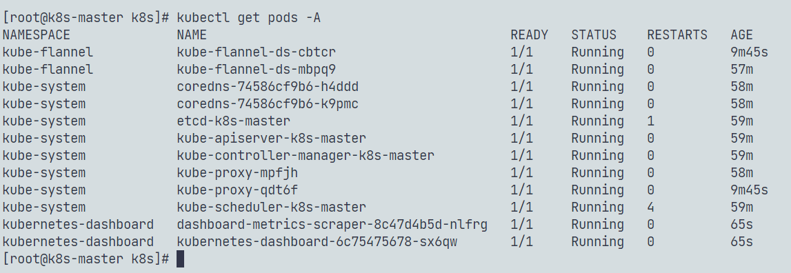 部署成功之后,可以看到 kubernetes-dashboard 相关的两个pod: